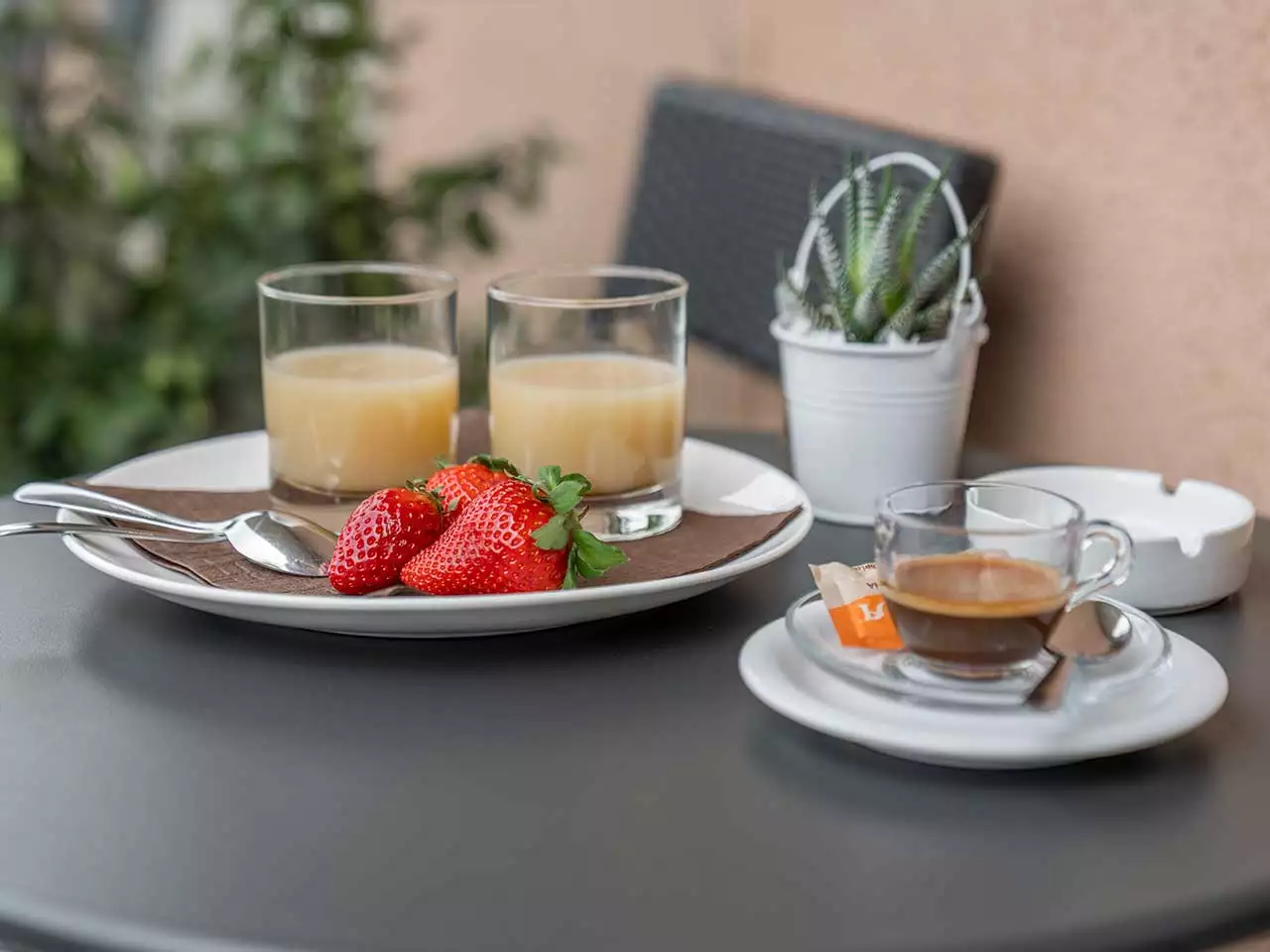 1 double bed (on request 2 single beds) + 1 single bed; Balcony with table and chairs overlooking the internal courtyard and garden Bathroom with shower equipped with towels, hair dryer, and soap Desk, Smart TV 40”, mini fridge Automatic air conditioning system Ultrafast Wi-fi up to 1 Gigabit/s;